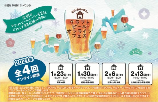 令和3年1月23日(土)から4週にわたって、つくり手と飲み手が一体となってクラフトビールの美味しさや楽しさを体感するコミュニケーション・イベント「クラフトビール・オンラインフェス」を開催します。